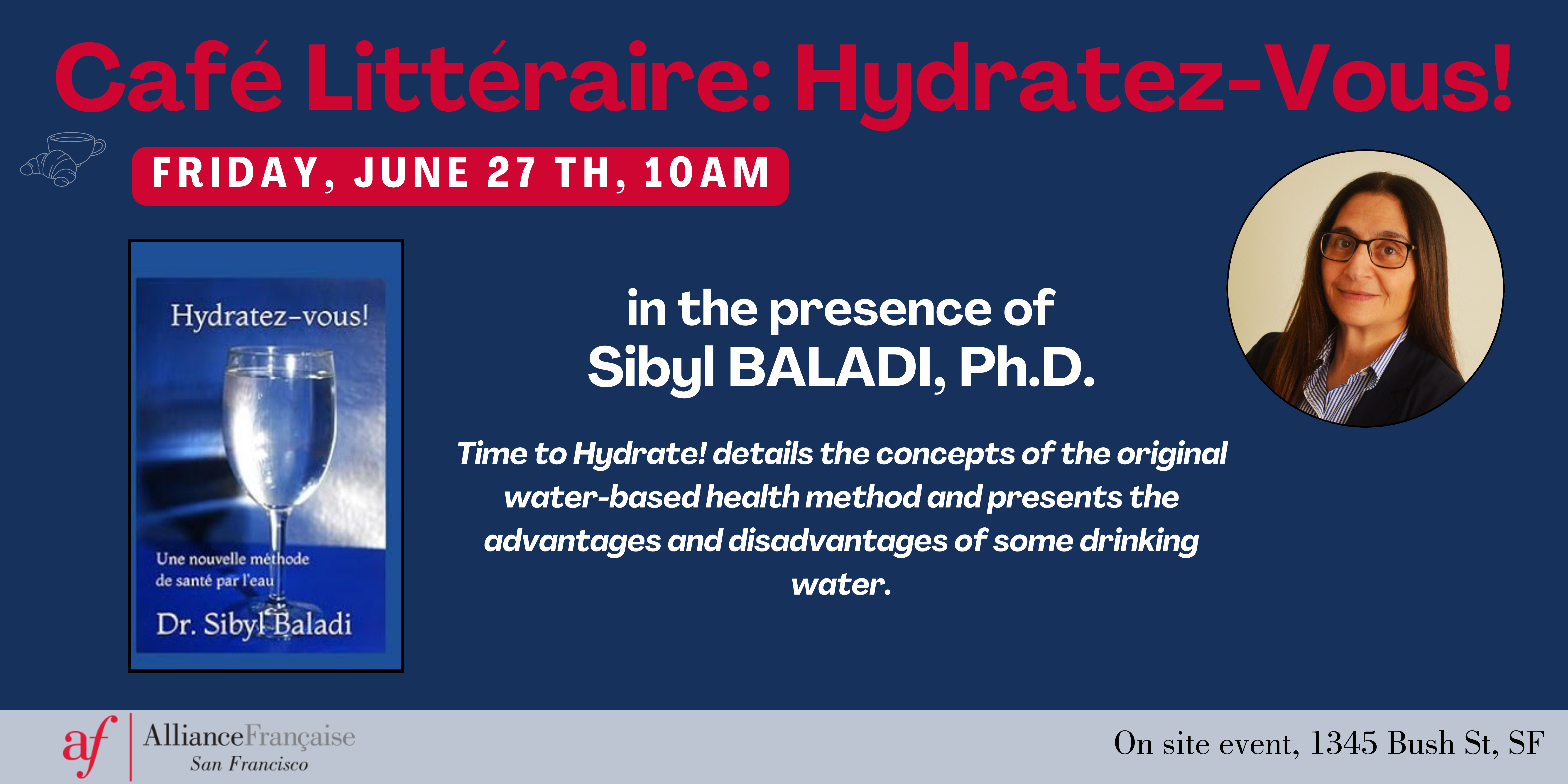 We are thrilled to invite you to a unique Café Littéraire event featuring Dr. Sibyl Baladi, Ph.D., a biochemist and expert in hydration for health and wellness.