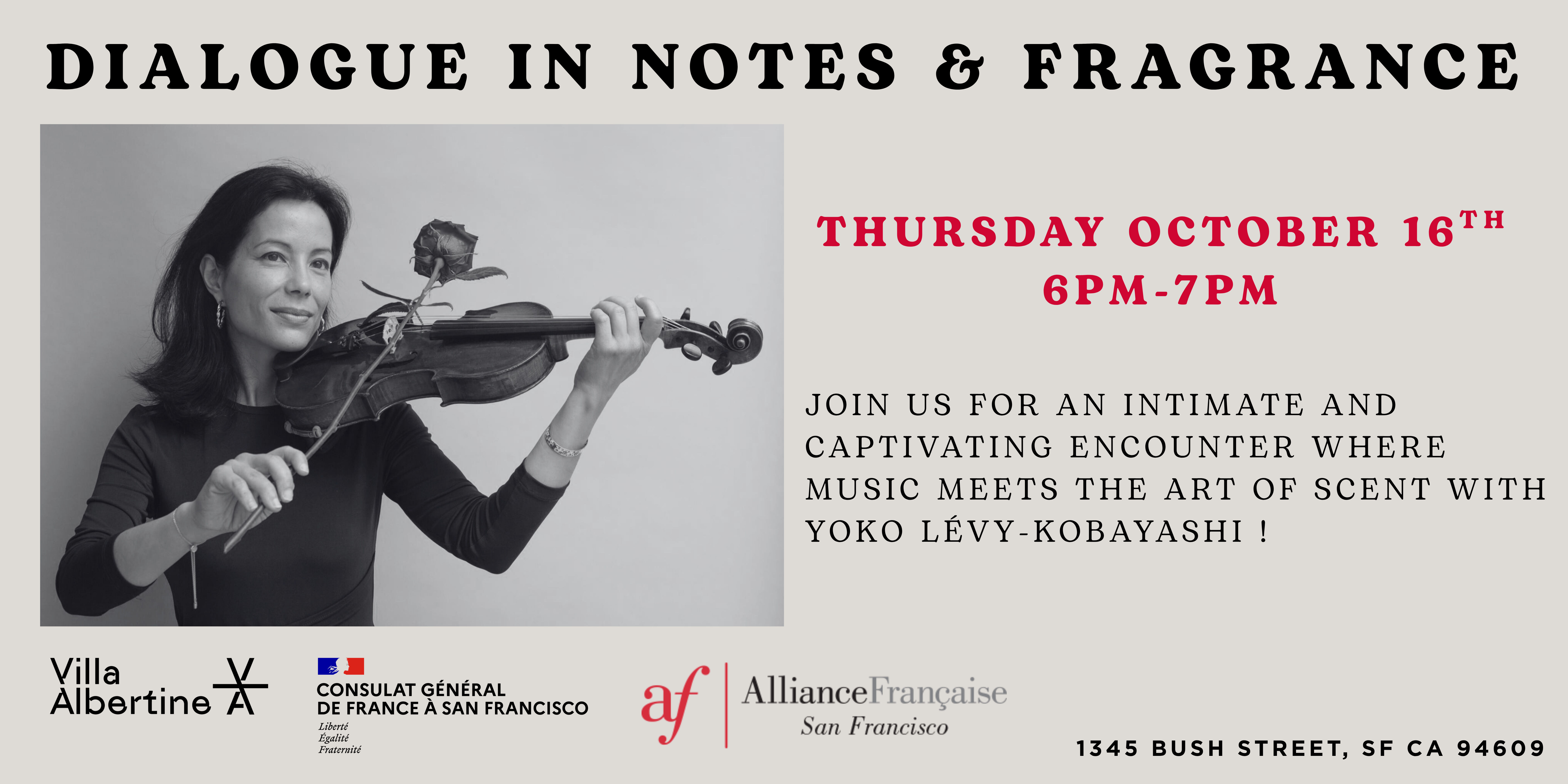Join us for an unforgettable cultural evening blending music, scent, and storytelling in a unique one-hour experience with Yoko Lévy-Kobayashi—renowned violinist and trained perfumer. Presented in partnership with Villa Albertine and the Alliance Française of San Francisco, this multi-sensory event will unfold in four captivating parts: