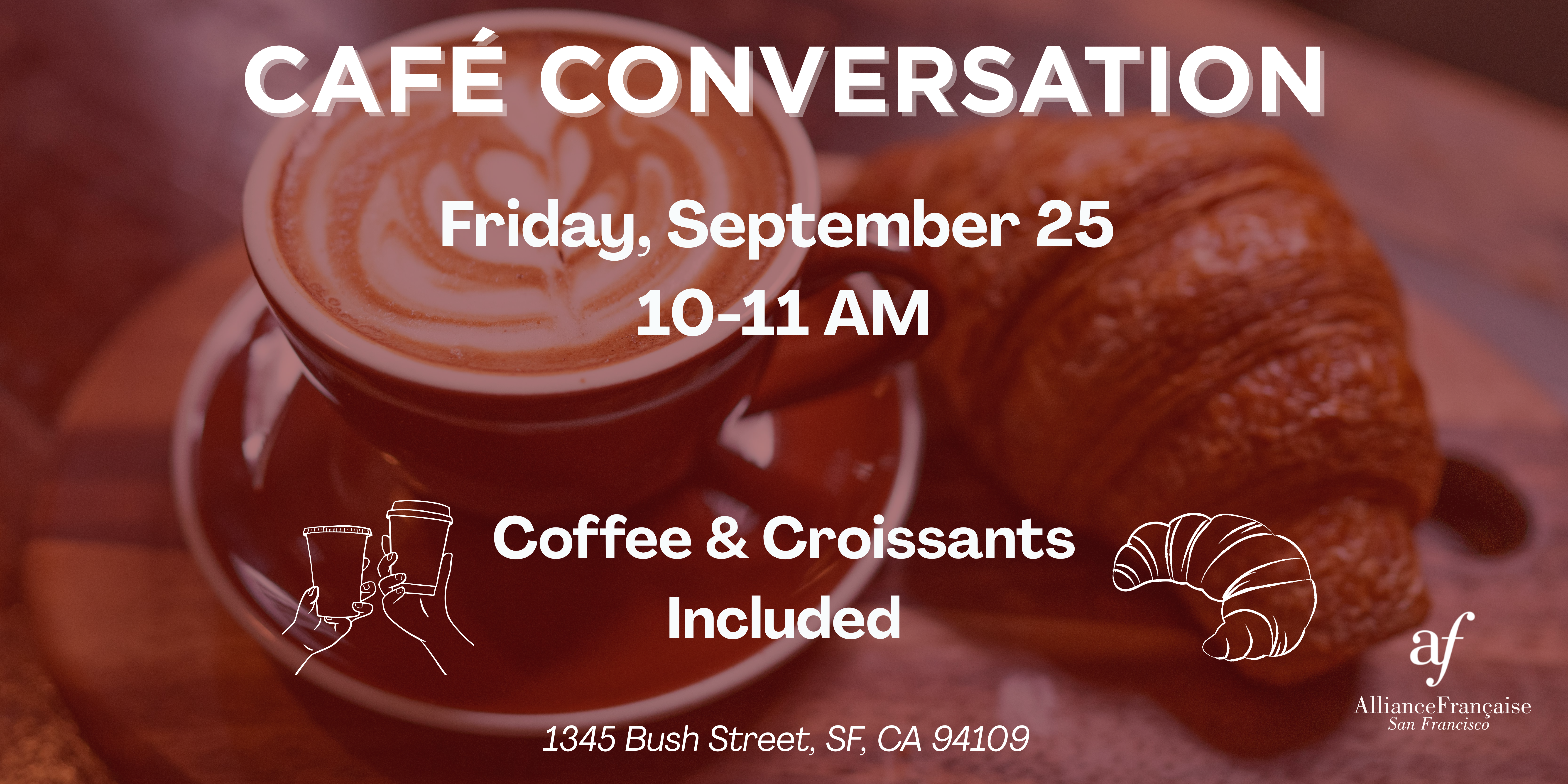 Every other Friday from 10:00am to 11:00am, let's meet in-person at the Alliance Française, to chat about a specific theme in French while sharing a cup of coffee or tea and a croissant.