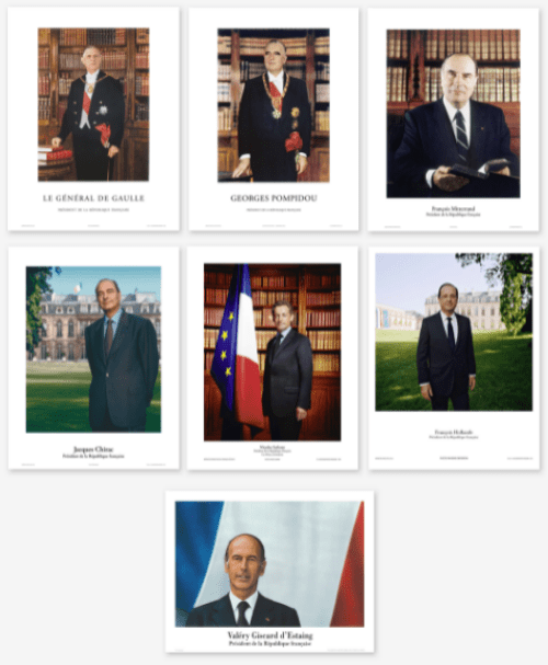 Charles de Gaulle a établi le standard avec son portrait, pris à la bibliothèque de l’Élysée en 1958 — et la même pour le portrait de son successeur, Georges Pompidou. De Gaulle regarde à la droite, et Pompidou à la gauche.