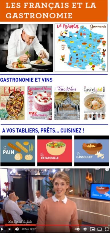 You will find a broad selection of culinary magazines and engaging videos on Culturethèque to take you to the next level on your French gastronomic journey. Check out the Gastronomie et Vins section to find wonderful magazines such as Cuisine et Vins that introduce you to famous chefs sharing their favorite recipes and wines or Elle a Table to learn about the secrets of a well set french table. The engaging photography, interesting stories and detailed recipes will be sure to inspire and inform your next French culinary creation. Or you can watch this curated collection of videos that follow the travels of the French series Les Carnets de Julie as she finds all of the best regional recipes and terroirs to create delicious dishes that blend the talents of amazing guest chefs, growers and artisans. Enjoying listening to native French speakers explain the secrets of French gastronomy while exploring the beautiful countryside regions and history.