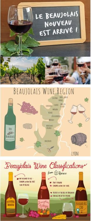 But there is more to Beaujolais regional wines than just Beaujolais Nouveau. There are plenty of terrific wines from this region in the center of France just north of the culinary capital of Lyon that are released later. Beaujolais Villages represents the second-tier wine from the region which are still fairly fruit-forward but are not produced via carbonic maceration and some have even seen a touch of oak. Beaujolais Villages should be consumed within two years. Beaujolais Cru embodies the best of the best from Beaujolais. The 10 Crus must come from one of ten quality-designated villages of Brouilly, Chénas, Chiroubles, Côte de Brouilly, Fleurie, Juliénas, Morgon, Moulin-à-Vent, Régnié and St.-Amour. Bonne journée Beaujolais Nouveau et bonne dégustation des vins du Beaujolais !