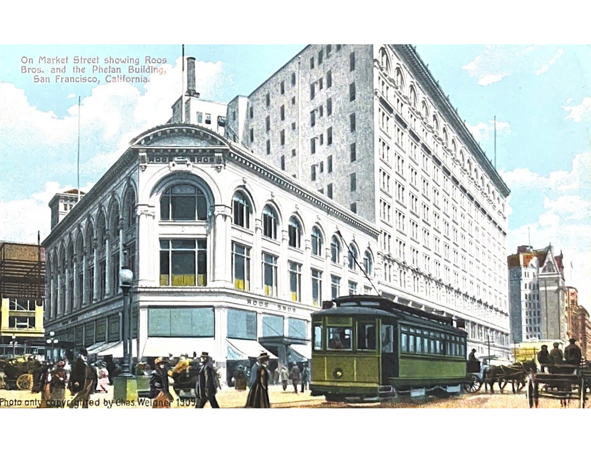 Adolphe Roos was born in Wissenbourg, Alsace and immigrated to San Francisco in 1864. Shortly after, he began working for a clothing merchant on Leidesdorff St. In 1865, Adolphe bought out his employer's shares and transformed the store into Roos Brothers. Their store was so popular that Adolphe and his younger brother Achille decided to move into a larger storefront on the corner of Post and Kearny a year later. Adolphe took care of purchasing and financial operations, while Achille managed sales and advertising. By 1935, Roos Brothers had expanded their business with nine stores throughout California and they were known as the destination for upscale menswear. Roos Brothers eventually merged with Robert Atkins in 1960, another well-known American clothier who continued to operate the firm into the 1990s.